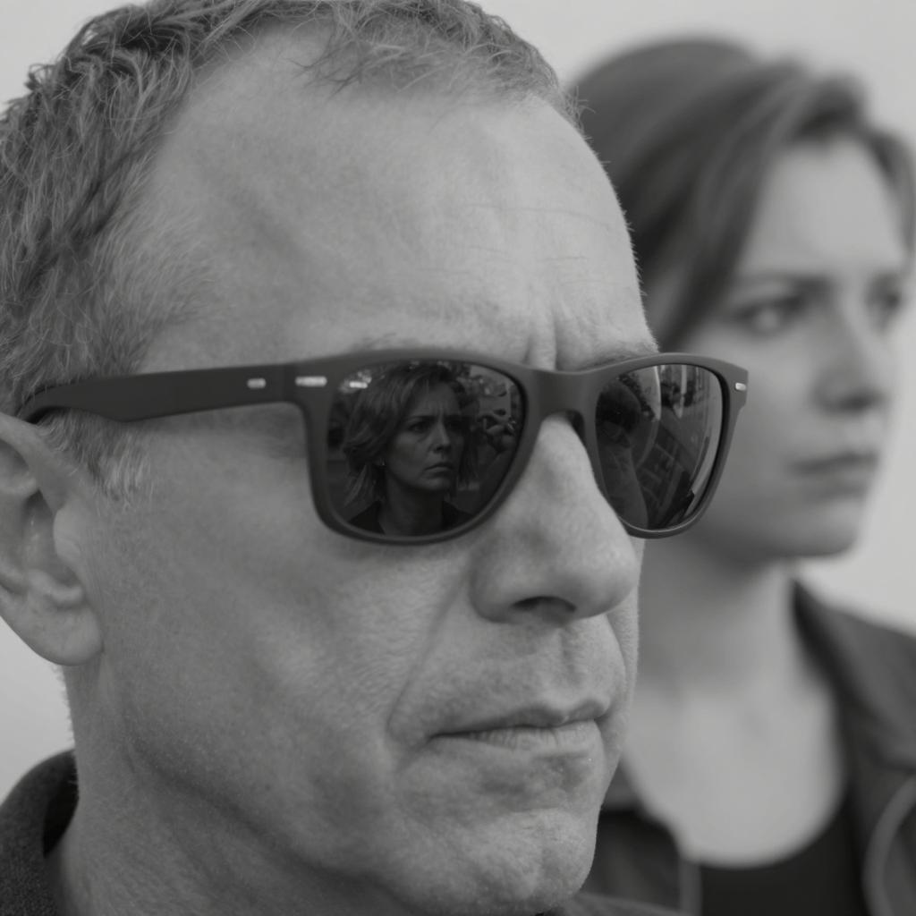 Close-up photograph of a middle-aged man with reflective sunglasses, showing a woman with wavy hair in the reflection. Pink car with chrome hood ornament in background. Man's face is serious, woman's expression is neutral.