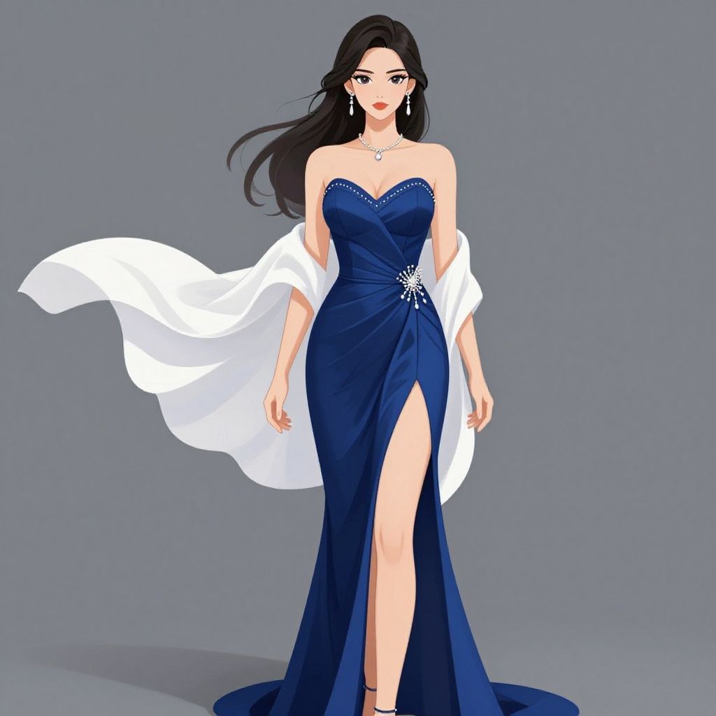 Digital illustration of a beautiful woman with long black hair in a strapless, navy blue, high-slit evening gown, accompanied by a flowing white sh