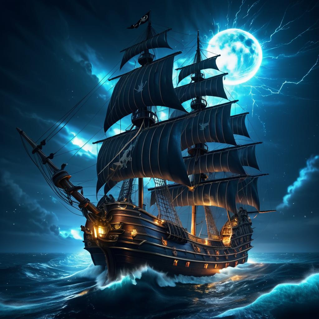 Pirate Ship Sailing in Stormy Night