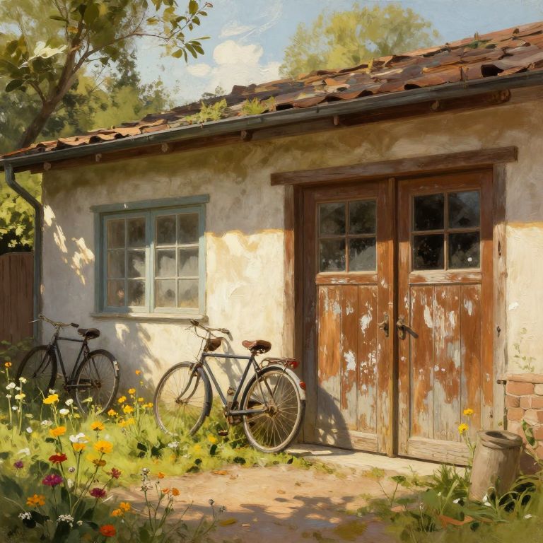 Rustic garages in a countryside setting surrounded by wildflowers and sunlight filtering through dusty windows, old wooden doors with peeling paint, classic bicycles leaning against walls, natural warm tones and soft shadows, painterly style.