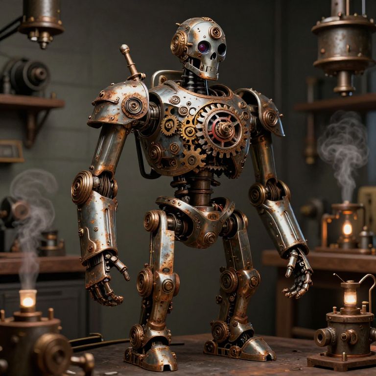 Robot skeleton art, steampunk style metallic bones with intricate cog and gear overlays, displayed in a vintage mechanical workshop, detailed rusted textures and glowing steam valves, atmospheric lighting
