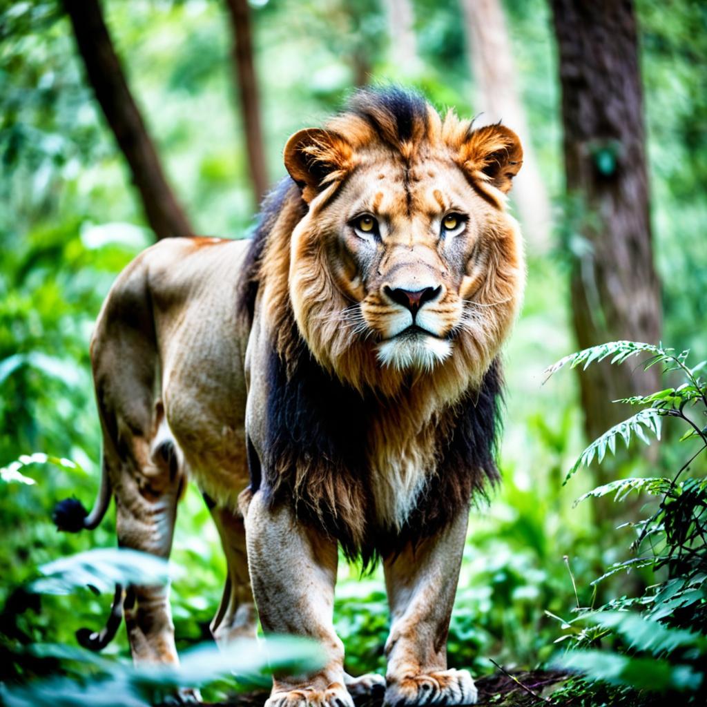 Close-up of a majestic male lion with a full mane standing in a lush green forest jungle. The background is blurred, highlighting the lion's intense gaze and detailed fur texture. The image captures the natural habitat with vibrant foliage and soft sunlight filtering through the trees.