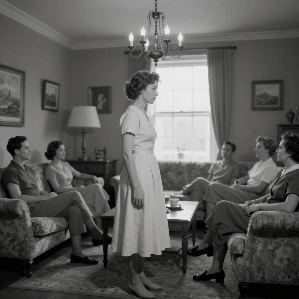 Black-and-white photograph of six women in vintage clothing, standing around a girl with a checkered skirt lifted to reveal her legs. The girl is centered, surrounded by women in floral dresses and aprons. One woman holds a plaid shawl. Background includes a moonlit night scene and a window.