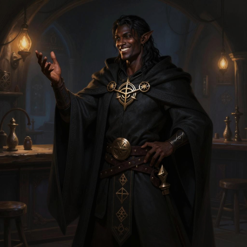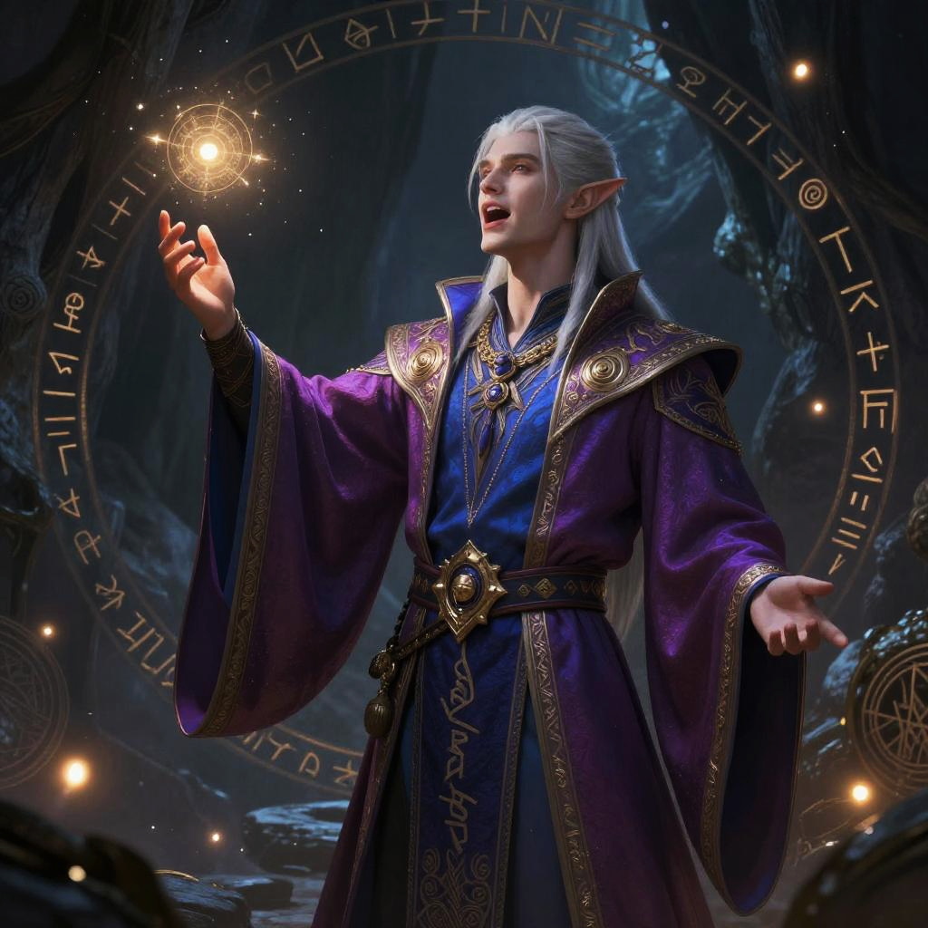 Mystical male drow bard with silver hair, vibrant robes, singing in a cavern filled with magical runes and floating lights, detailed fantasy character portrait