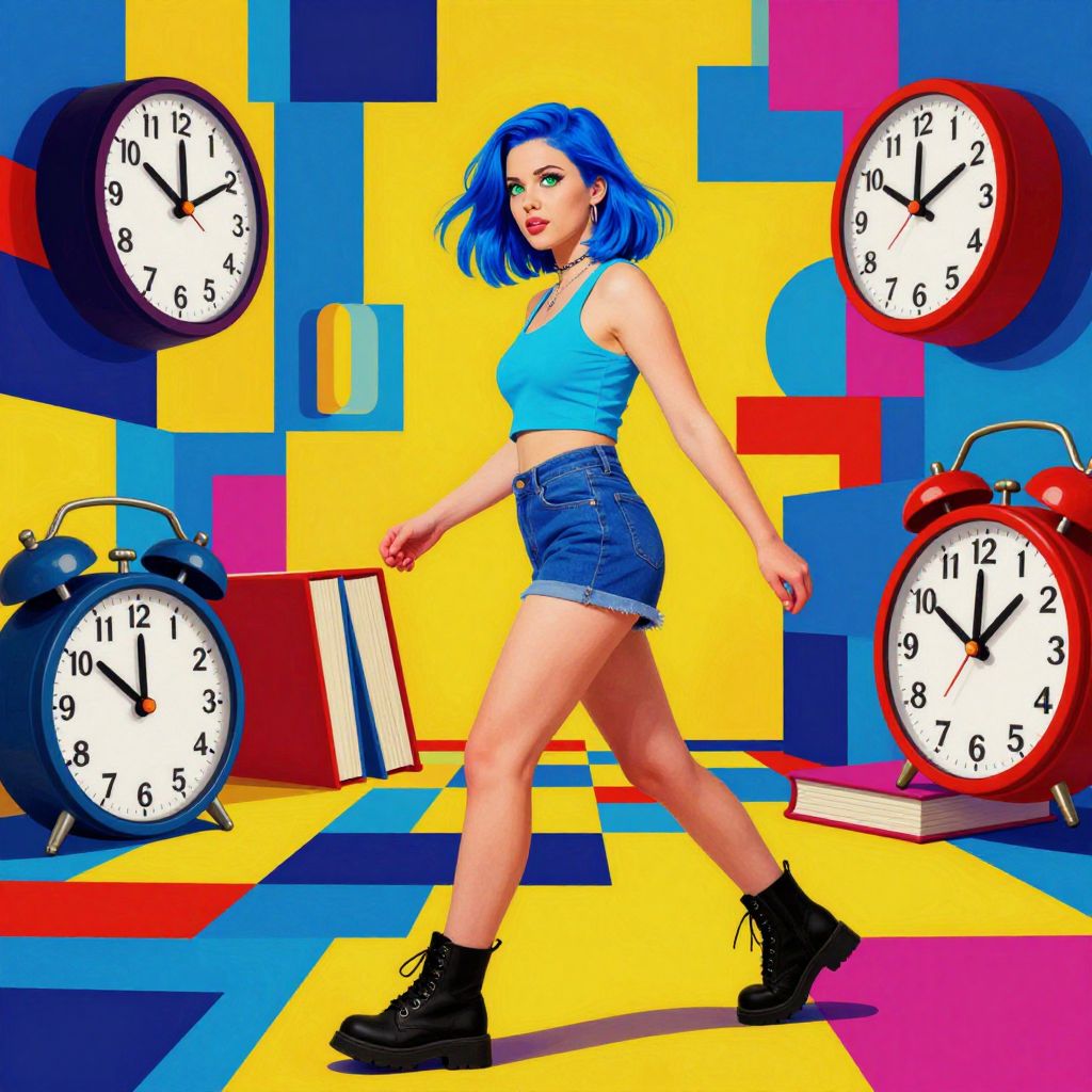 Bright pop art image of a blue-haired woman in a blue crop top and denim shorts, walking between four clocks, surrounded by colorful squares.