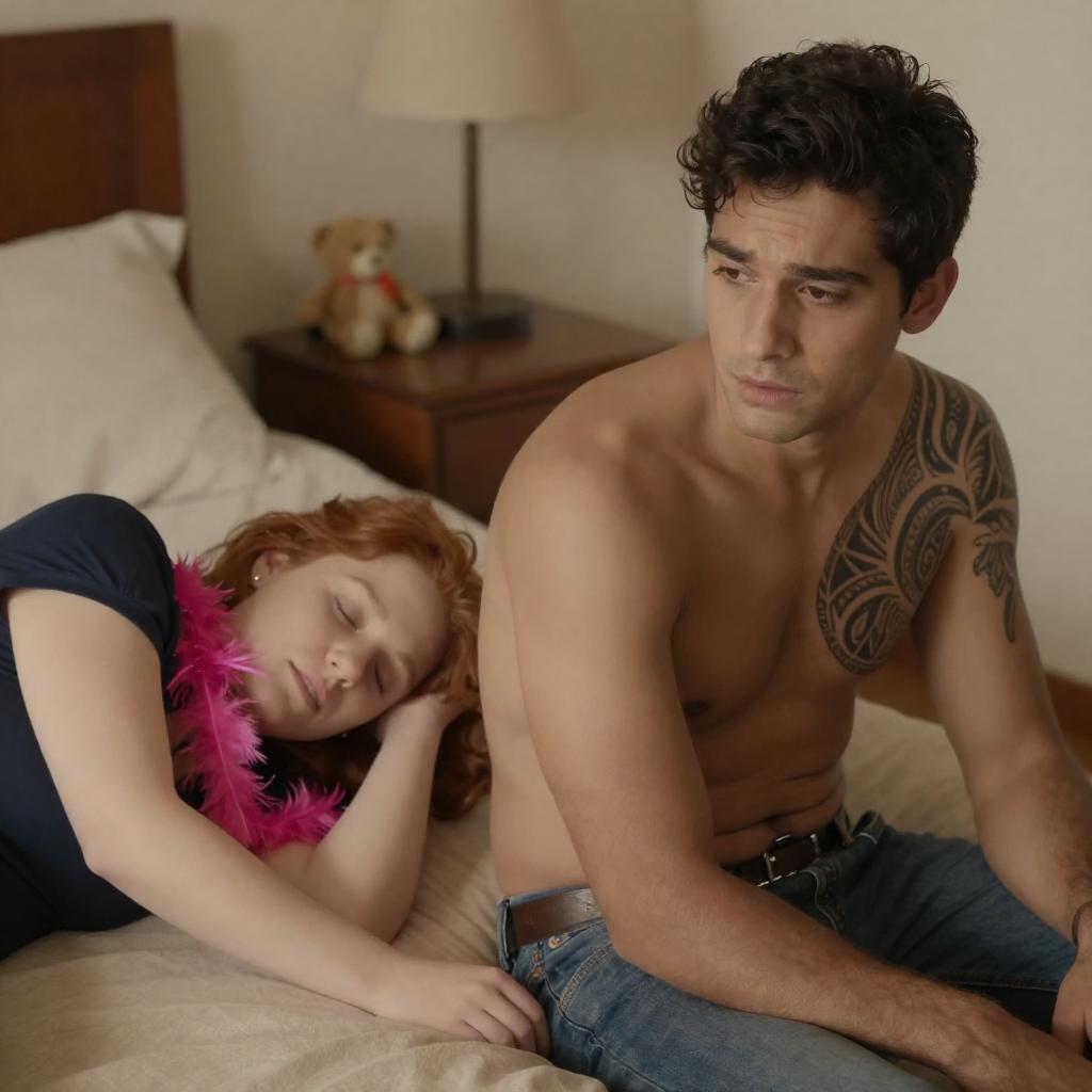 Shirtless man with dark hair, tribal tattoo on left shoulder, sitting on bed beside sleeping woman with red hair, wearing navy shirt. Pink feather garland, stuffed animals, pillows, and lamp on nightstand in background. Woman's arm extended above head. Man's expression concerned. Warm lighting.