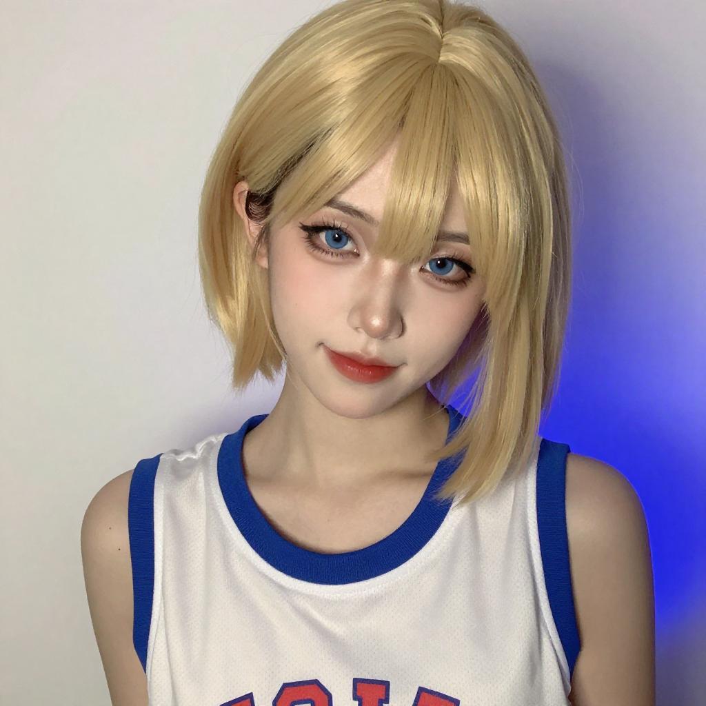 Digital artwork of a blonde woman with blue eyes, wearing a white and blue basketball outfit with "Tune Squad" on the chest, and white sneakers. She kneels on a bench in a locker room, with white lockers in the background. Her hair is styled in a short, messy bob with a bunny ear accessory. She has a fair skin tone and a slightly open mouth, giving a playful expression.