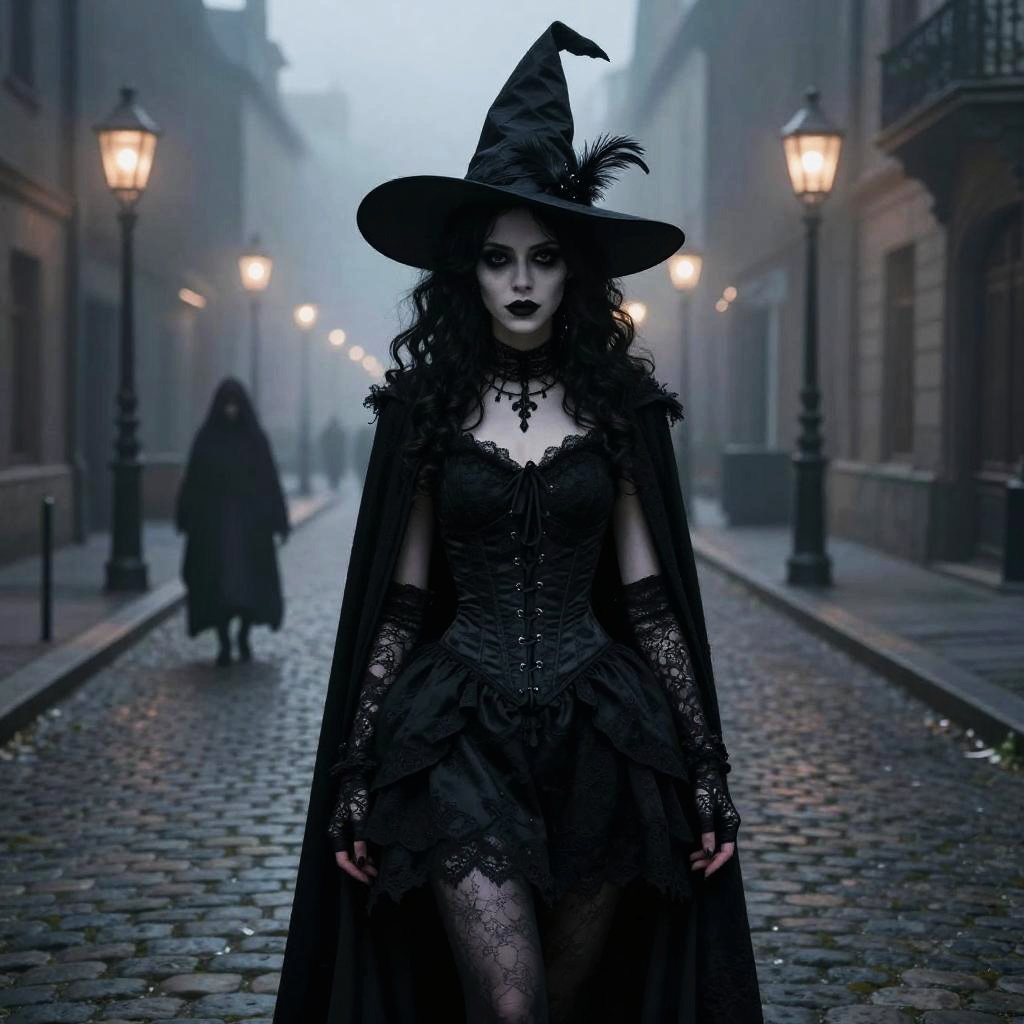 Photograph: Gothic witch with black lace dress, cape, and hat stands on misty cobblestone street, glowing street lamps, blurred figure in