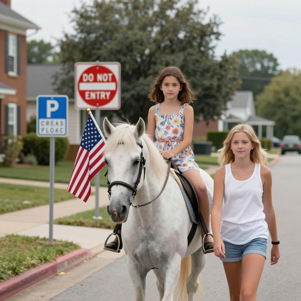 Three children riding bicycles on a suburban street. The central child in a red hoodie leads, with a primate in a white blanket and crate helmet on the bike in front. Two other children follow. Large trees and a yellow car in the background. Primate's face visible, looking forward. Suburban setting with trees and houses. Daylight.