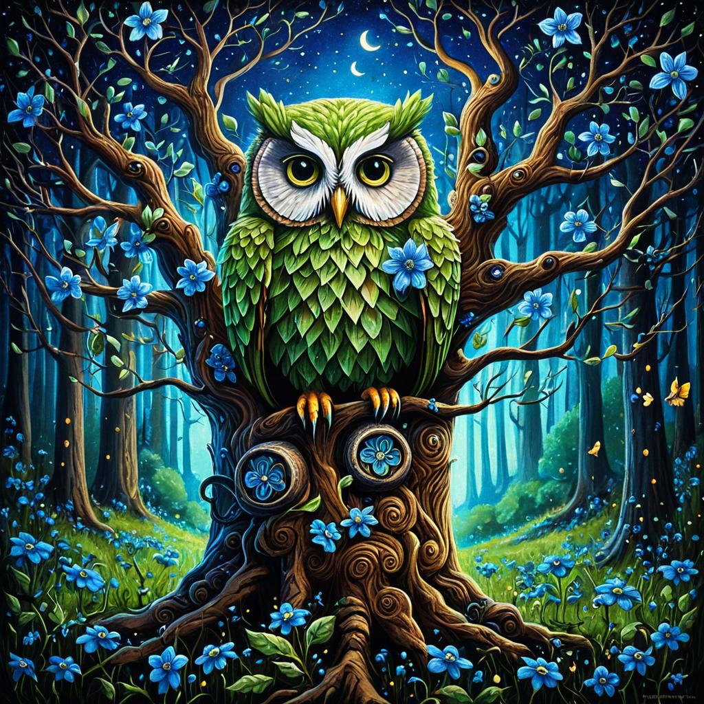 A surreal and detailed fantasy artwork depicting a tall anthropomorphic green tree with blue flowers and a glowing blue light within its trunk. A silver-furred, mystic wolf with glowing blue eyes sits majestically in the tree's branches, illuminated by a full moon. Below the tree, a lone figure dressed in a green cloak stands on a forest path surrounded by glowing blue flowers. The scene conveys a magical and dreamlike atmosphere in a whimsical night forest setting.