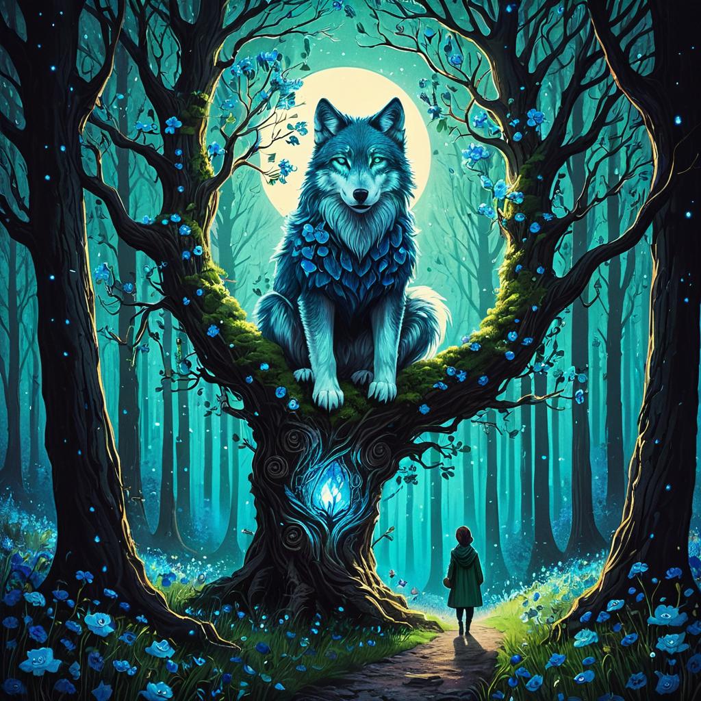 Mystical Forest with Friendly Wolf on Enchanted Tree