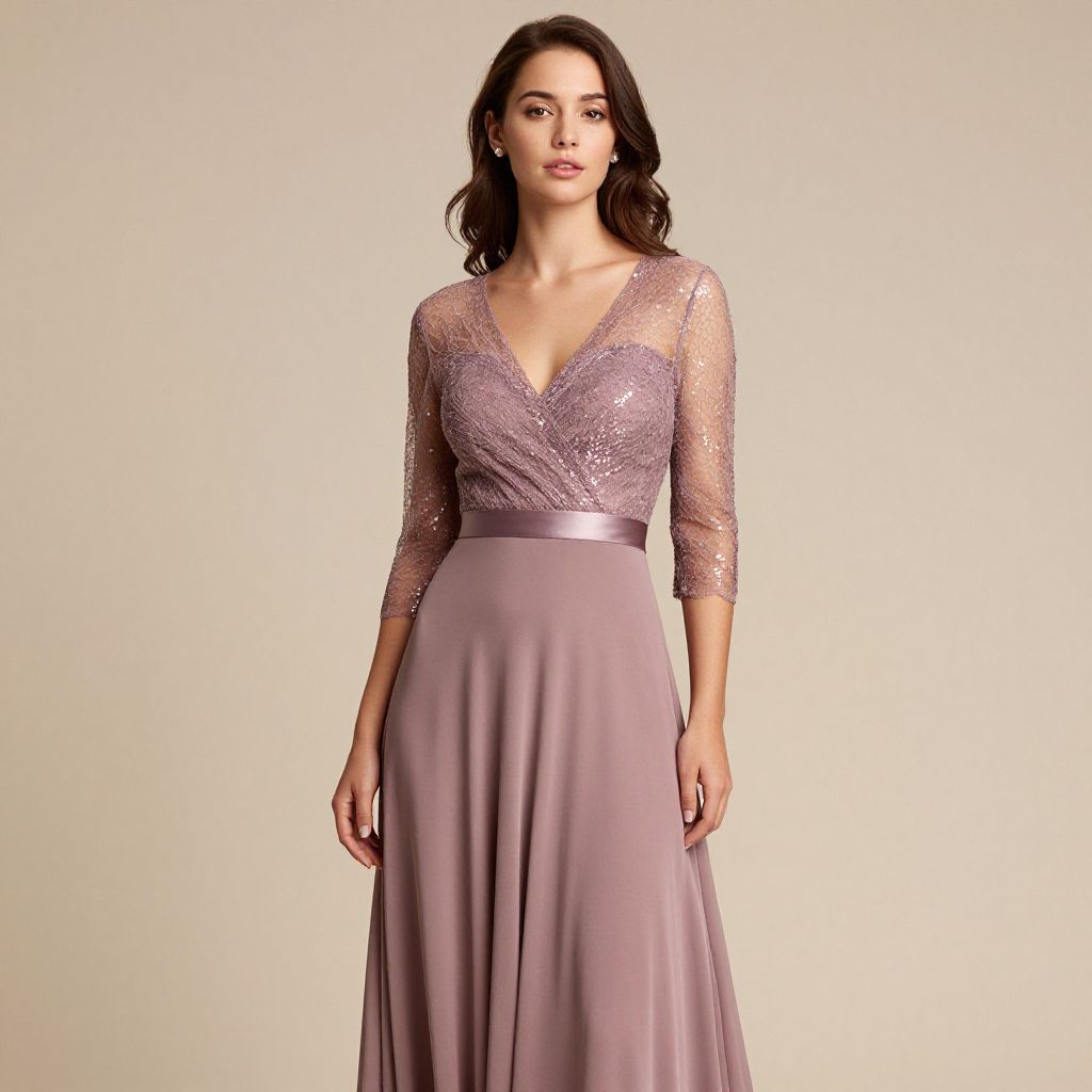 "Woman, romantic elegance, mauve A-line gown, sequined lace bodice with V-neckline, three-quarter sheer lace sleeves, satin waistband, flowing chiffon skirt, floor-length, simple stud earrings, soft makeup, studio background with warm beige tones.. Sexy. Pretty face and beаutiful eyes. Big breasts."
