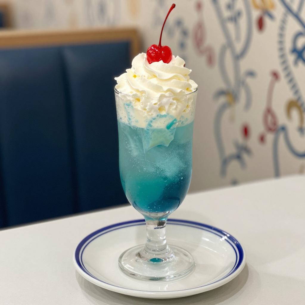Glass dessert glass with gradient blue-green liquid, topped with white whipped cream, white syrup, and a red cherry. Blue rimmed plate beneath. Background includes blurred dark blue chair and patterned wallpaper.