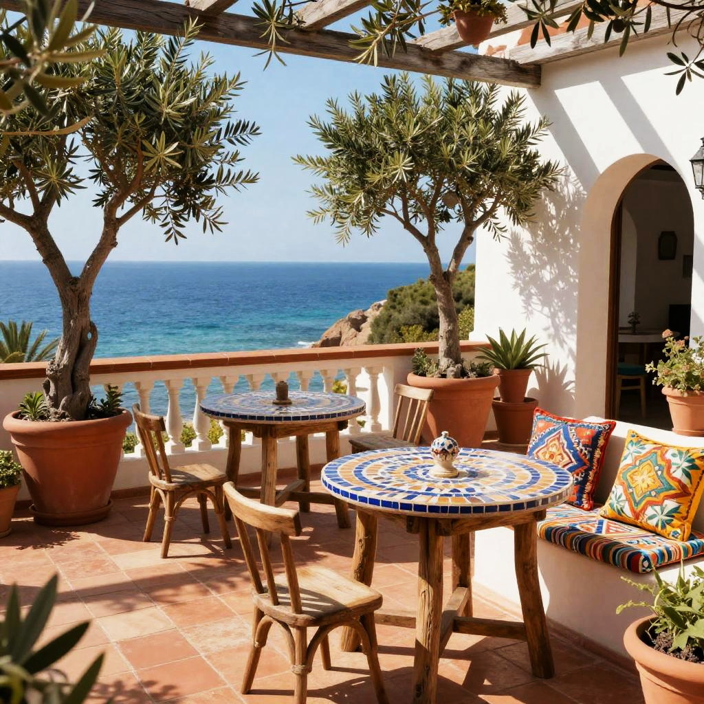Patios adorned with Mediterranean style décor, terracotta tiles, olive trees in large pots, rustic wooden tables with ceramic mosaic tops, colorful cushions, morning light casting soft shadows, Mediterranean coastal vibe, hyperrealistic digital art