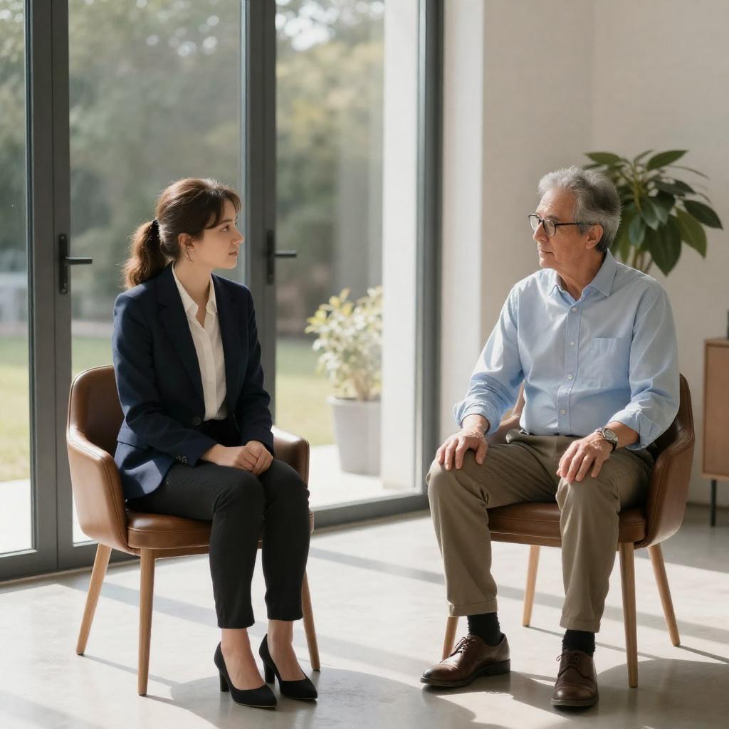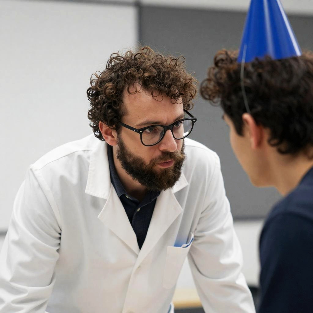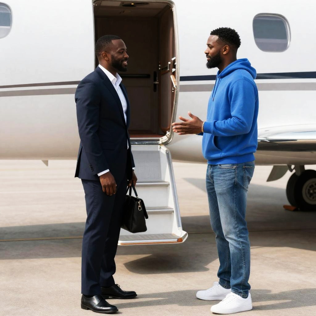Two middle-aged men in an airplane hangar. One in a purple blazer, red shirt, and glasses, gestures animatedly. The other in a green jumpsuit, crouches, facing him. Background: airplane wing, another man in gray shirt, chairs.