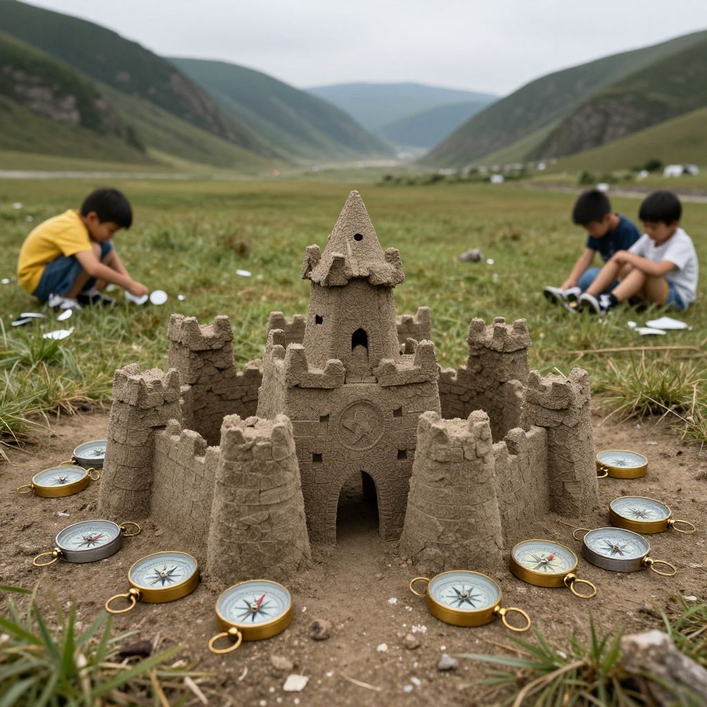 Children construct castles from broken compasses in a valley where direction is a myth invented to soothe the lost.