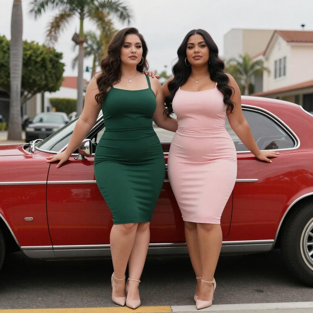 Photograph of two curvy women with long dark hair, leaning against a red classic car. The woman on the left wears a green, form-fitting dress and beige heels, while the woman on the right wears a pink, tight dress and matching heels. They stand on a city street with palm trees and buildings in the background, both with arms around each other, exuding confidence and elegance.