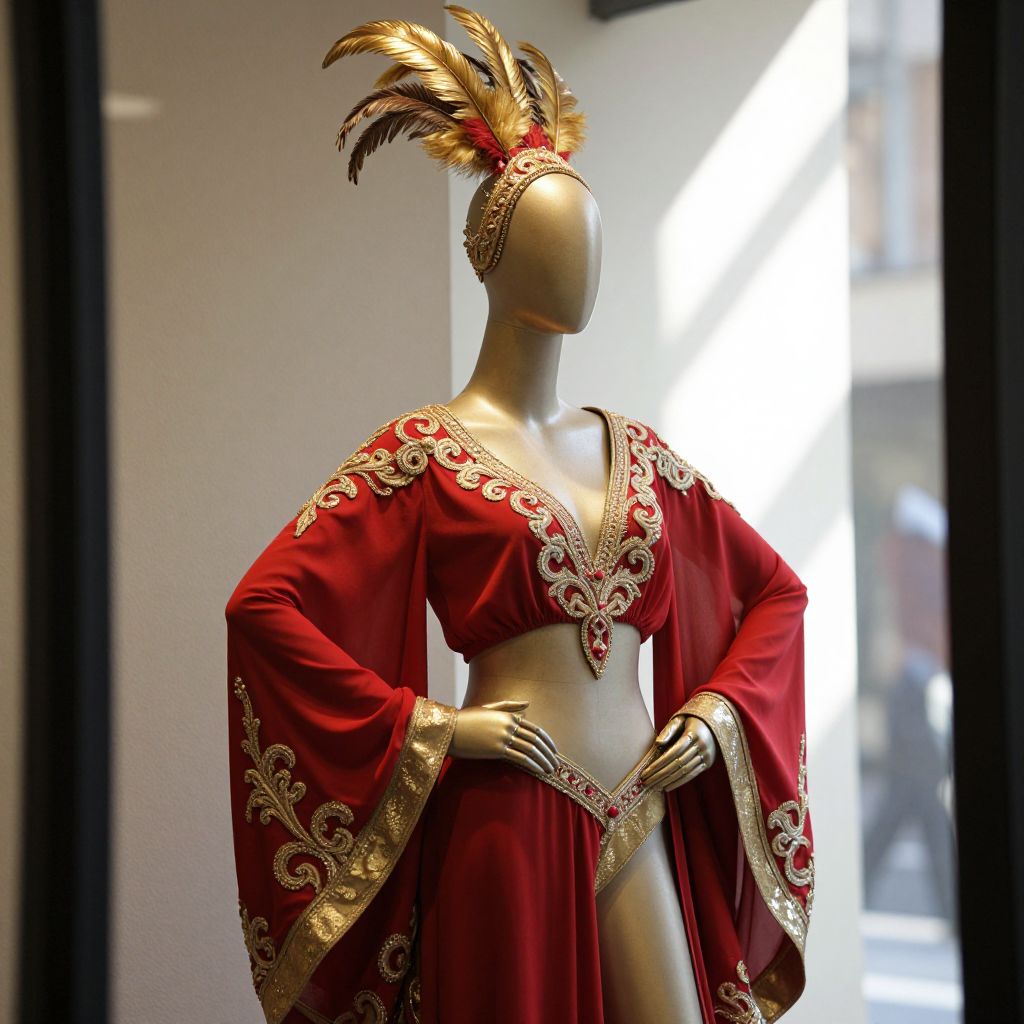 A detailed mannequin standing confidently in a stylized storefront, wearing an elegant red and gold outfit with intricate embroidery and flowing sleeves, complete with a luxurious feather headdress adorned with golden feathers that catch the light, giving a vibrant and dramatic visual appeal. The mannequin has a smooth, realistic surface with subtle texture to suggest fabric and metal, and its posture exudes elegance and sophistication, set against a backdrop of soft daylight filtering through a window.