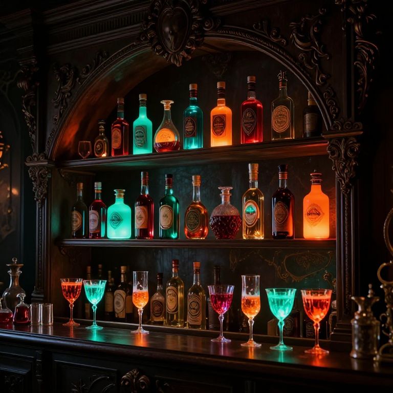 Photograph of a dark, ornately carved wooden bar shelf illuminated with vibrant, multicolored neon lights. The shelf holds various bottles of liquor in shades of blue, green, orange, and red, each with distinct labels. Below, five crystal glasses, two with green lights and three with orange lights, are neatly arranged. The glasses and bottles reflect the colorful lights, creating a vivid, almost magical atmosphere. The shelf and background are adorned with intricate, vintage-style patterns, enhancing the luxurious and mysterious feel of the scene.