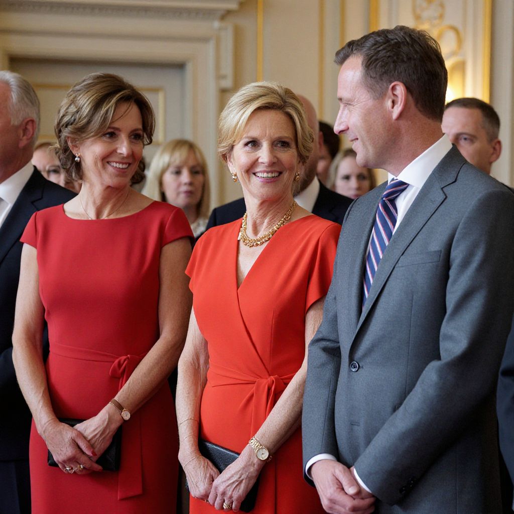 Photograph of three adults standing in an elegant, well-lit room with classical architecture. Two women, both wearing bright red, short-sleeved dresses with gold necklaces, are smiling at a man in a dark gray suit, white shirt, and blue striped tie. The woman on the left has short, light brown hair, while the woman on the right has blonde, short hair. The man has short, dark hair and is looking at the women. Background includes several other people in formal attire, slightly out of focus, with a cream-colored wall and decorative molding. The atmosphere is formal and cordial.