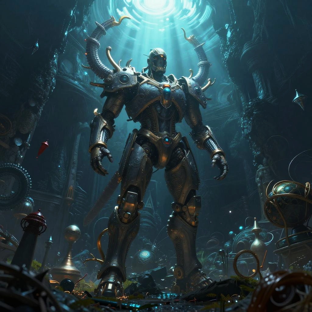 A highly detailed, futuristic armored warrior stands in a dimly lit, ancient abyssal chamber. The warrior's armor features intricate engravings, glowing blue gems, and horn-like protrusions on the shoulders. Rays of light penetrate from an opening above, illuminating the dark, mysterious environment filled with mechanical and mystical objects.