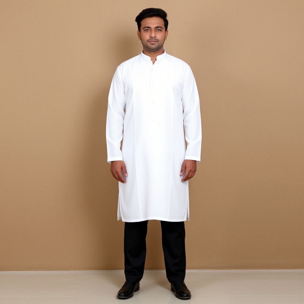 Photograph of a South Asian man standing against a plain beige background. He has short black hair, a trimmed beard, and brown skin. He is wearing a white, long-sleeved traditional kurta that reaches mid-thigh, black trousers, and black shoes. His expression is neutral, and he stands with his arms relaxed at his sides. The lighting is even, highlighting the simplicity of his attire and the plain backdrop. The floor is a light gray color, contrasting subtly with the beige wall.