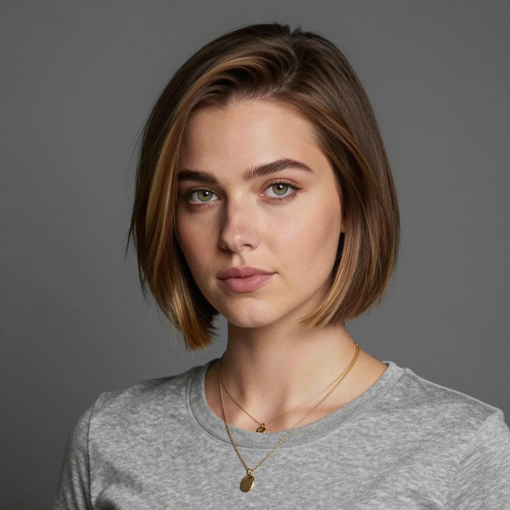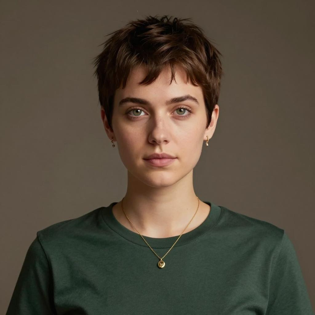 Pixie cut thin hair, photorealistic portrait of young woman, short brown hair, side-swept bangs, green eyes, fair skin, neutral expression, wearing dark green t-shirt, simple gold necklace with small pendant, small dangling earrings, soft brown gradient background, realistic lighting, upper body shot, front-facing, subtle makeup, slight blush, realistic ures, soft focus, CGI-generated, realistic details, professional studio lighting, calm and serene atmosphere