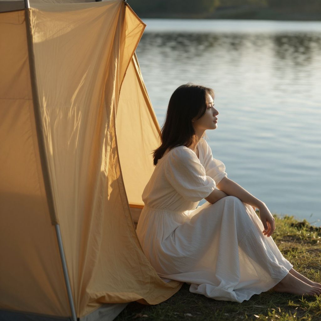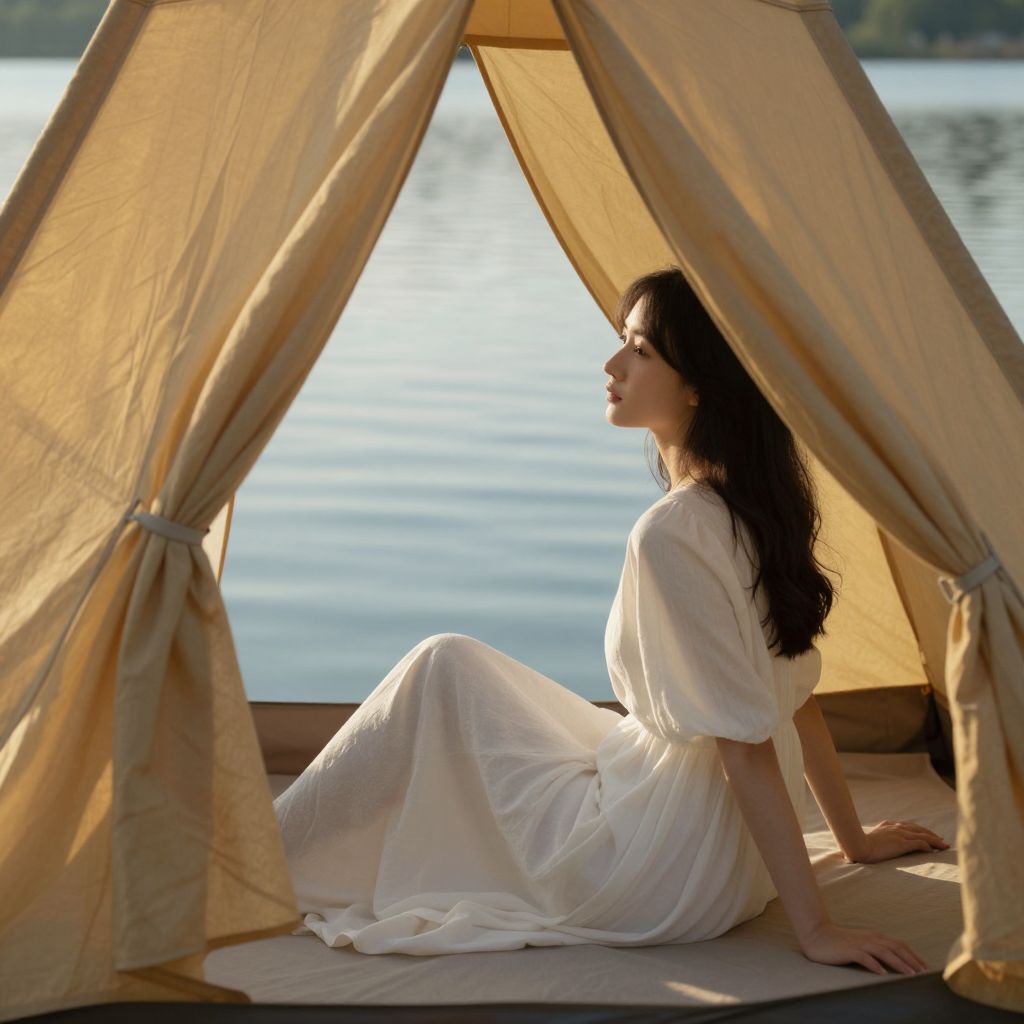 Photograph of a serene scene featuring a young woman with long, dark brown hair, sitting inside a beige canvas tent. She is dressed in a flowing white dress with short sleeves, and her profile faces a calm, sunlit lake in the background. The tent's fabric is slightly translucent, allowing soft sunlight to filter through. The woman is seated on a simple, beige mat, with her right arm resting on the ground and her left hand gently touching her thigh. The tent's triangular entrance frames her contemplative, peaceful expression. The lake's surface reflects the sunlight, creating a tranquil atmosphere.