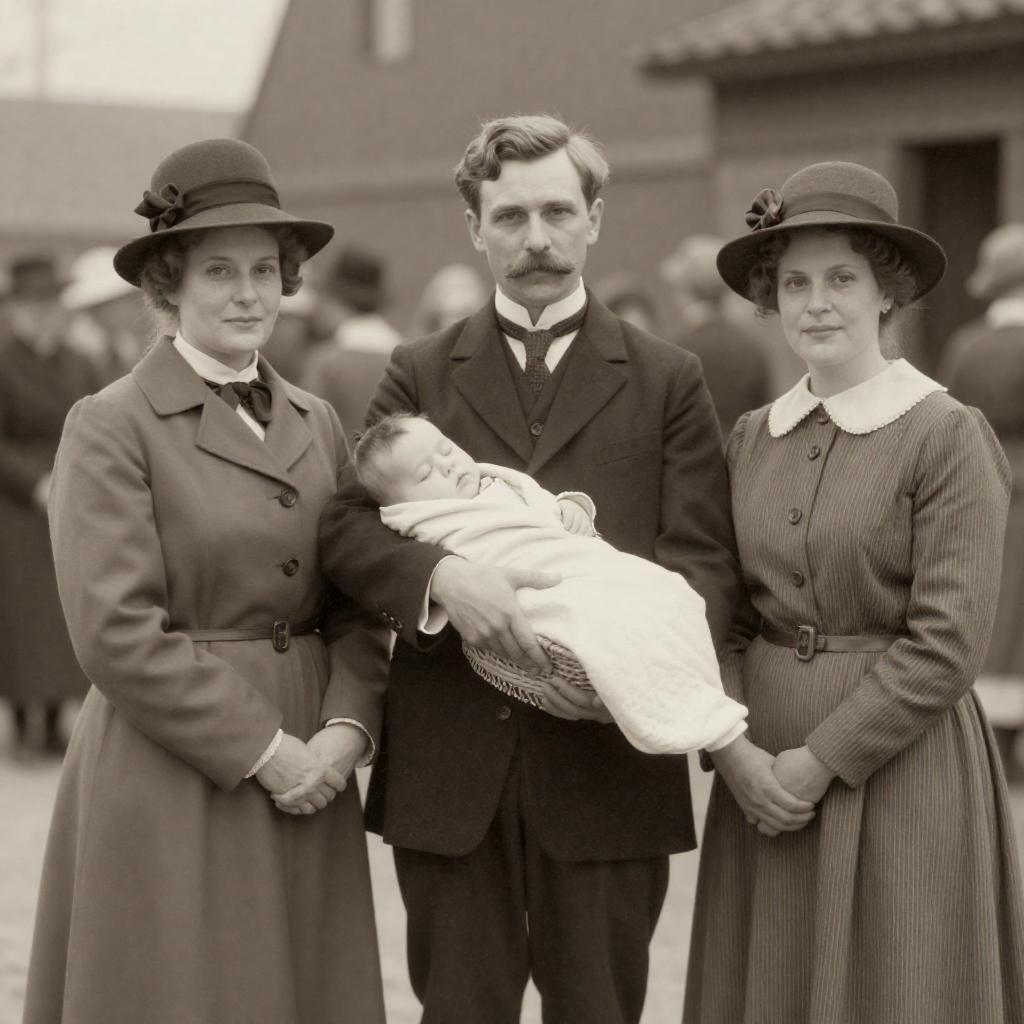 Sepia-toned photograph featuring a man and a woman dressed in early 20th-century attire. The man stands wearing a dark three-piece suit, bow tie, and a light-colored fedora hat, holding a vintage camera. The woman is seated on stone steps, dressed in a white lace-trimmed dress and wide-brimmed hat, also holding a vintage camera. The woman looks directly at the camera while the man gazes away. The background includes blurred foliage and architectural elements.