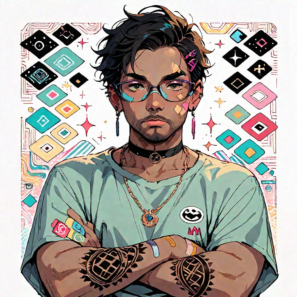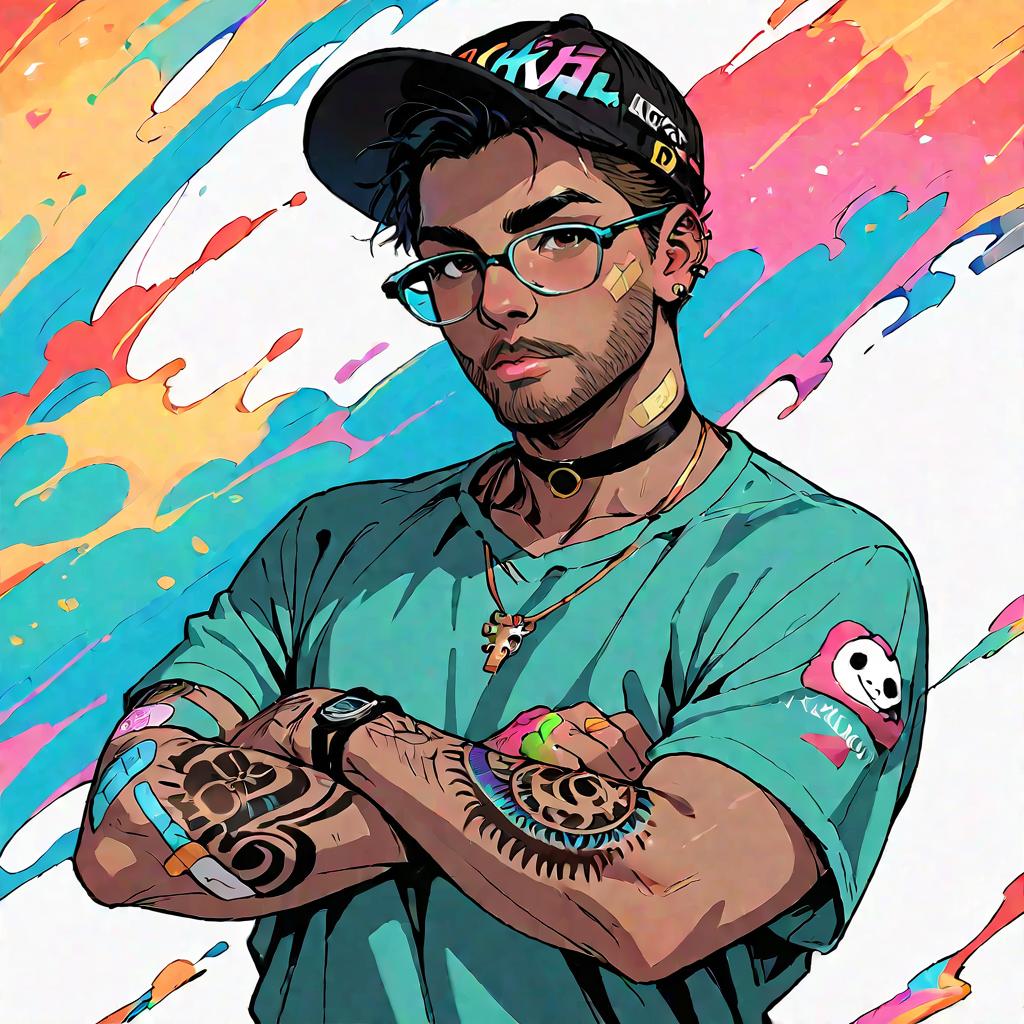 Score_9, score_8_up, score_7_up, source_anime, 1boy, jewelry, sticker, hair ornament, hairclip, ear piercing, bandaid on face, ring, choker, necklace, bandaid on hand, tattoo, colorful, black eyes, dark-skinned male, facial hair, glasses, black headwear, green shirt, crossed arms, fat