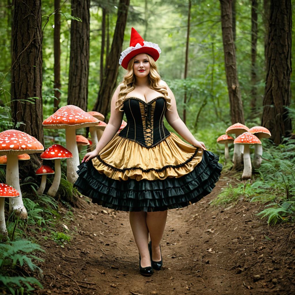 Plus size mushroom damsel, photorealistic, woman in fairy tale forest, wearing golden brown dress with black corset and ruffled layers, red hat, black shoes, long wavy blonde hair, standing on dirt path, surrounded by red and white spotted mushrooms, tall green trees in background, daylight, detailed ures, fantasy, whimsical, fairytale style, centered composition, soft lighting