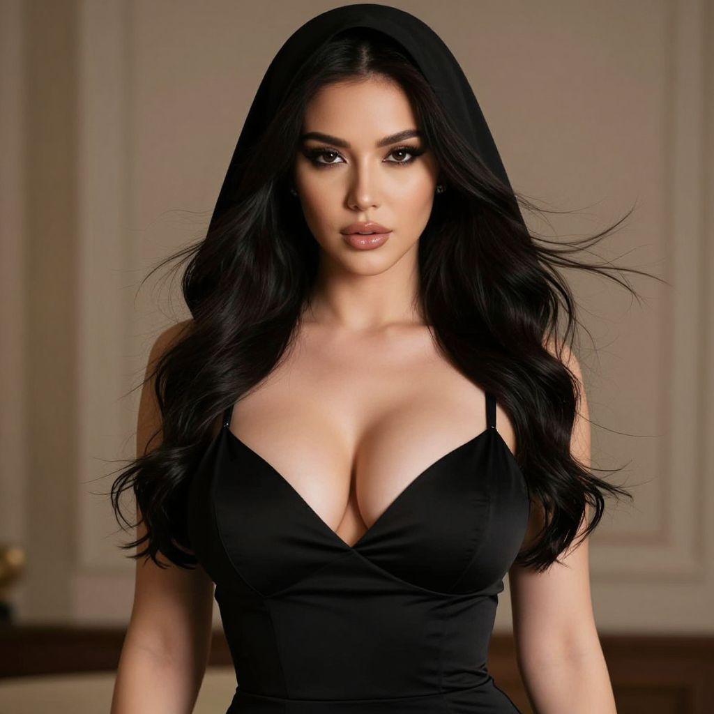 A sexy woman with big tits wearing a sleek black dress with a hood over her head, the hood partially covering her face, her long hair flowing freely, glowing under soft ambient lighting, elegant and mysterious atmosphere, cinematic lighting, hyper-realistic details, seductive gaze, high-resolution, 8K, fantasy style
