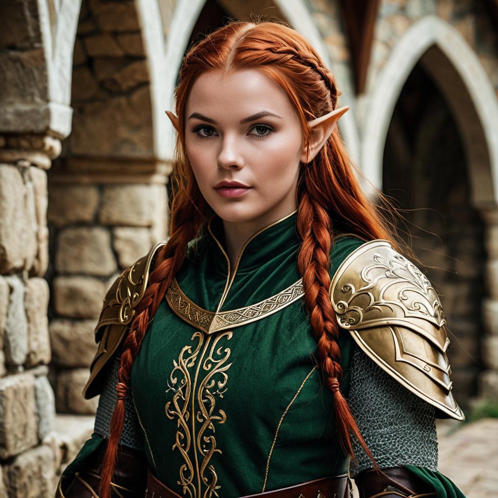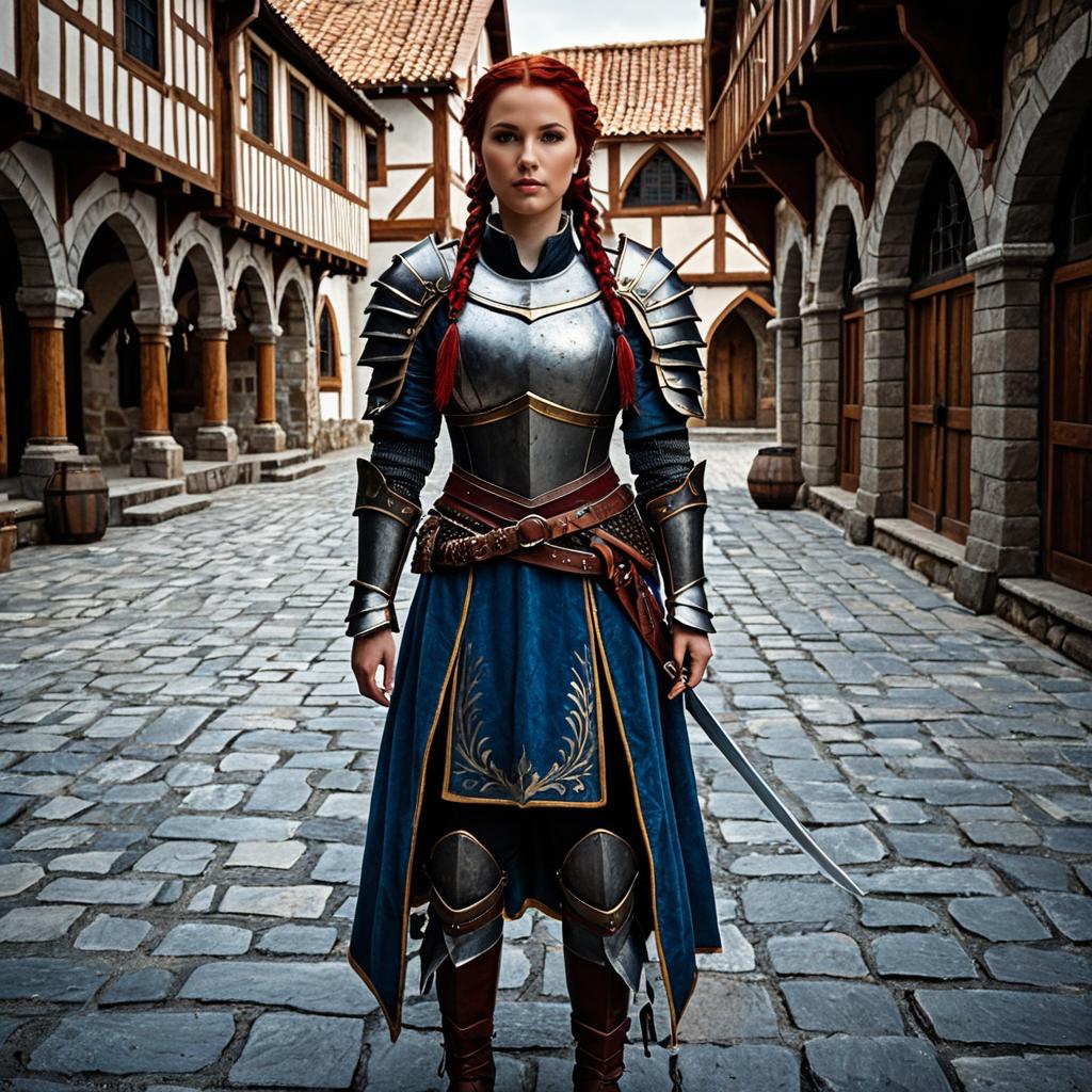 Digital painting of a young woman with red braided hair wearing detailed medieval-style blue and gold armor. She stands on a stone-paved street with a background of wooden medieval buildings. The armor features intricate designs and leather straps, with realistic lighting and subtle shadows, evoking a fantasy medieval setting.