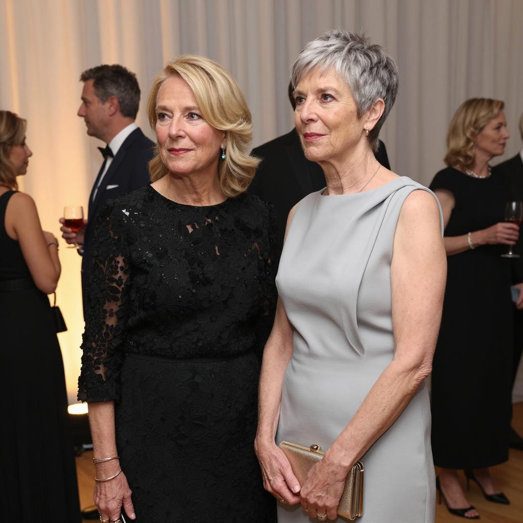 A dimly lit photograph of a nightclub scene. An older woman with curly hair and a dark suit sits at a table, laughing, with a cocktail and star-shaped ice cubes. A blonde woman in a sheer dress leans towards her. Several other people in the background are partially visible, with red lighting casting shadows. A glass with red liquid and a napkin are on the table.