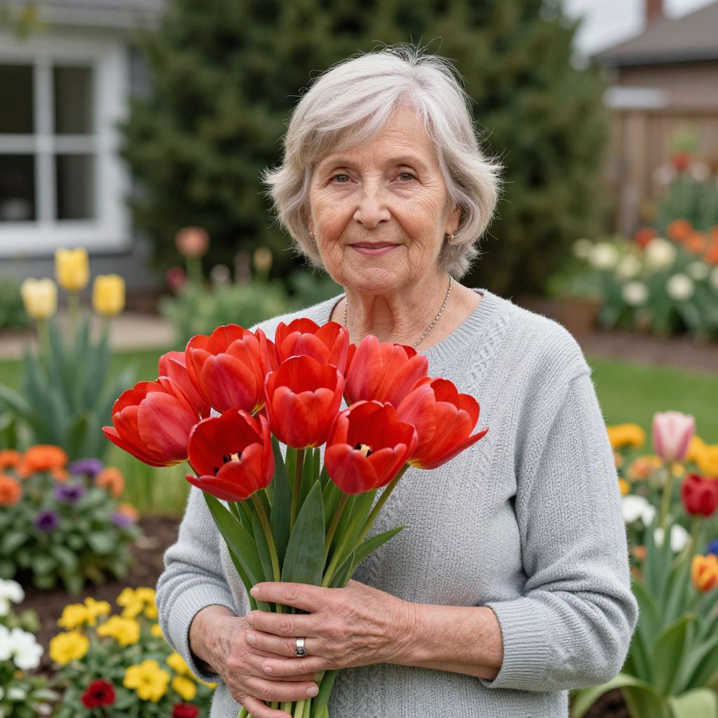 Photograph of an elderly woman with short gray hair, wearing a light blue denim shirt, holding a bouquet of vibrant red tulips in a colorful garden