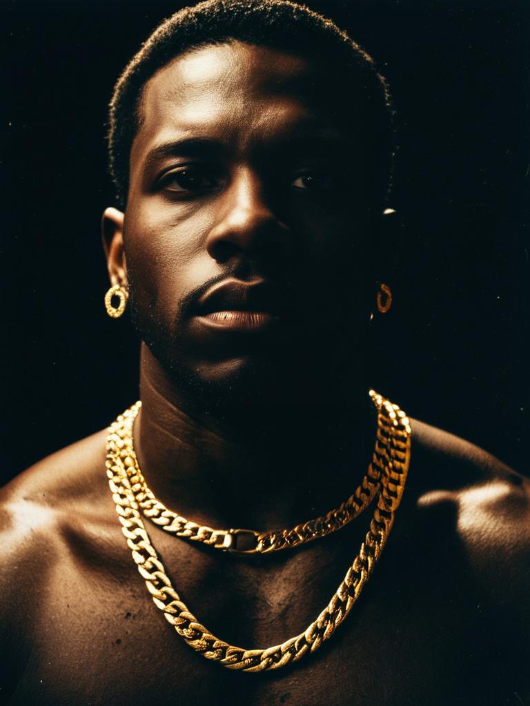 Man wearing Gold Jewelry Chain, dramatic studio portrait with sharp lighting