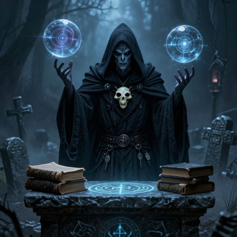 A digital fantasy illustration depicts a hooded, skeletal figure with glowing blue eyes, wearing a dark cloak adorned with a skull pendant. The figure stands in a misty, blue-lit graveyard, holding two glowing, circular, magical orbs above outstretched hands. The stone pedestal before them has a glowing blue magical circle and two old, worn books. Tombstones and crosses are scattered in the foggy background. The scene is eerie and mystical, with a dominant blue color palette and a focus on occult magic.