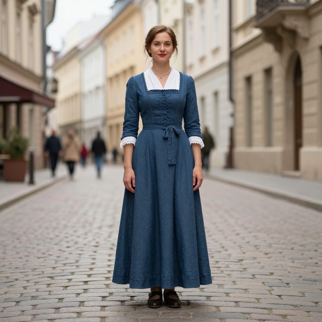 Old European Dress, woman in blue dress standing on cobblestone street in european city