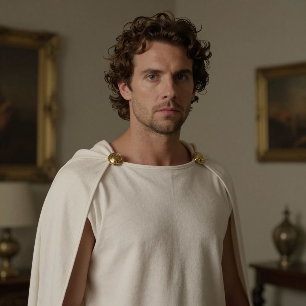 Greek god halloween, a close up of a man with a cape on standing in a room