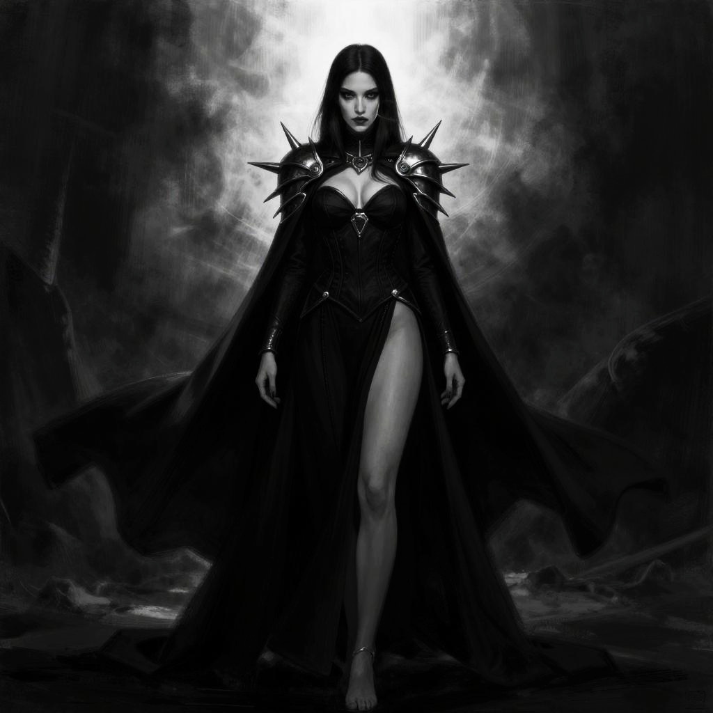 This digital drawing features a mysterious, dark-haired woman in a flowing black cloak with spiked shoulder armor. She's standing in a dramatic, shadowy background with a bright, glowing light behind her. Her cloak billows around her, revealing a revealing outfit that shows off her toned legs and a hint of her large breasts. The monochromatic black-and-white color scheme adds a gothic, eerie vibe.