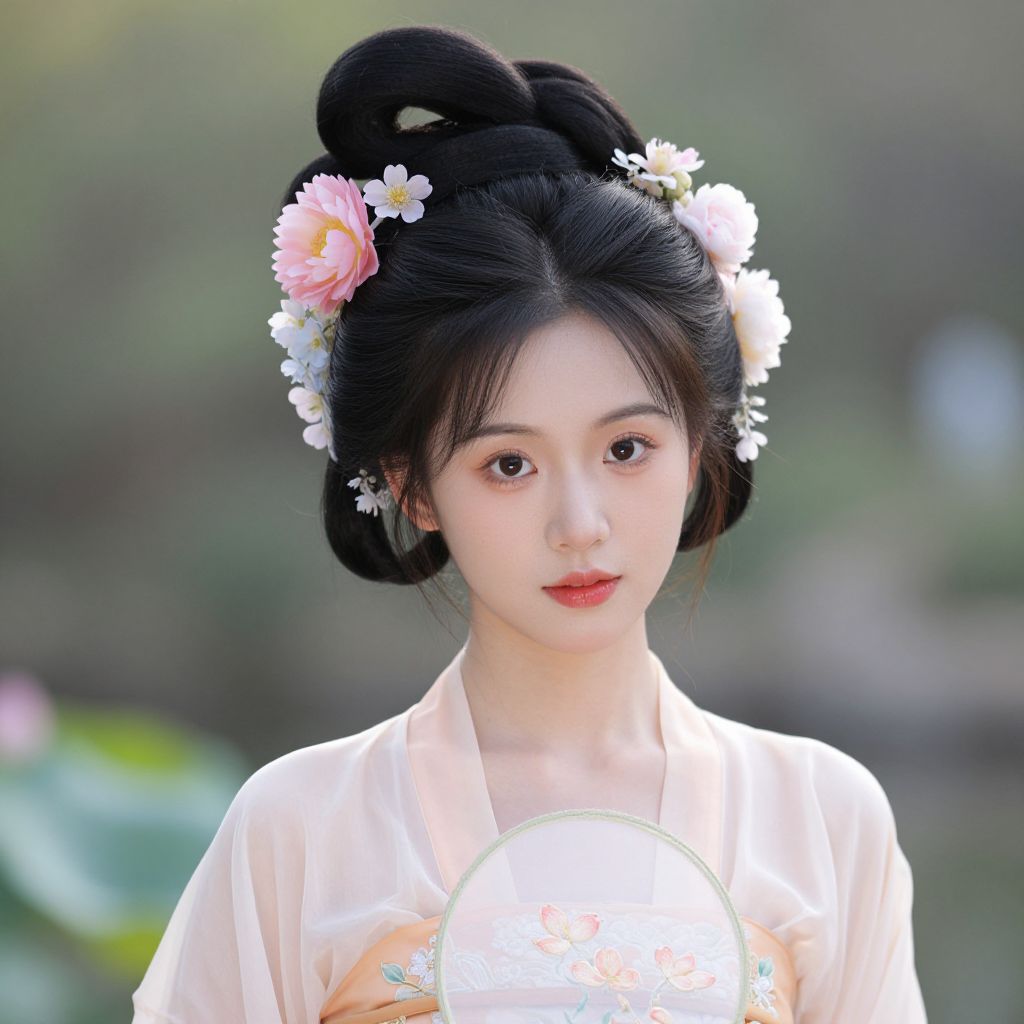 Photograph of an East Asian woman with black hair in an elaborate bun, adorned with flowers, wearing a sheer white kimono, holding a glowing fan