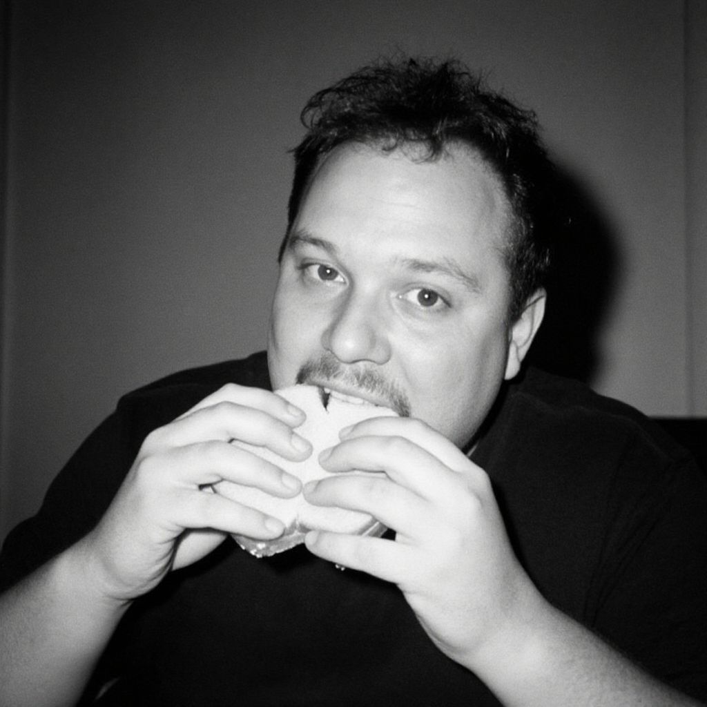 A black and white film photograph snapshot of a fat man biting a sandwich. no hands. no fingers. holga, lomo, lomography, retro, toy camera, film, tri - x, plus - x, vintage