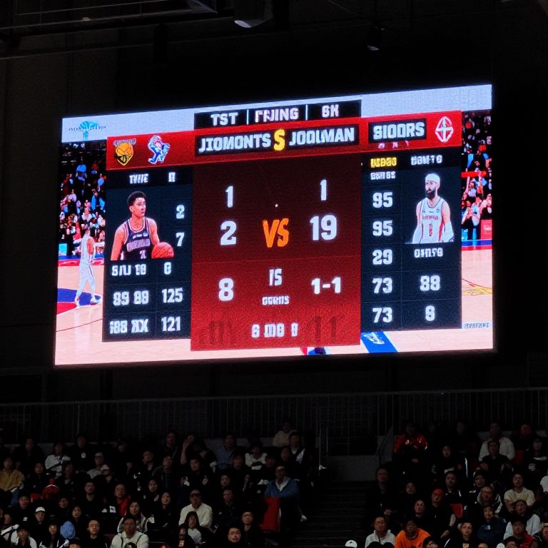 Jumbotron scoreboard illuminated brightly during a basketball game, displaying animated player highlights and scores, vibrant crowd in background, high resolution digital screen technology, realistic textures, energetic and intense game vibe, cinematic panoramic shot.