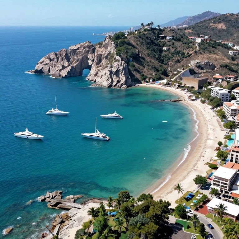 Aerial view of Acapulco coastline with dramatic cliffs and turquoise ocean, luxury yachts and sailboats scattered in the bay, lush tropical vegetation surrounding the beach resorts, clear sunny weather, hyper-detailed and photorealistic