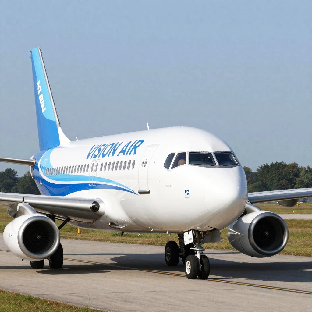 Photograph of a white and blue KLEIN Vision Air aircraft with a BMW car body, featuring blue accents and "VISION AIR" text on the side. The plane is on wheels, parked on a sunny road with a grassy field and trees in the background. The car's headlights and grille are visible, and the wings are extended horizontally.