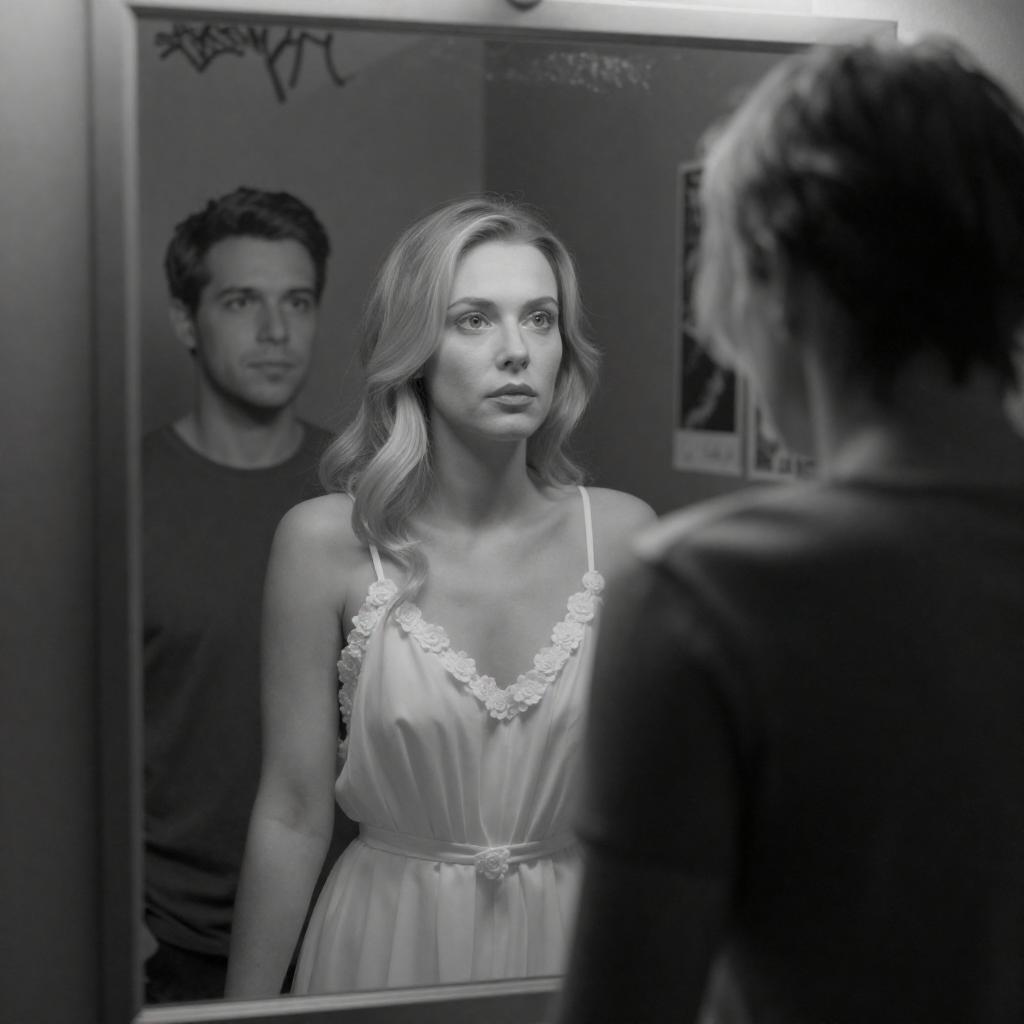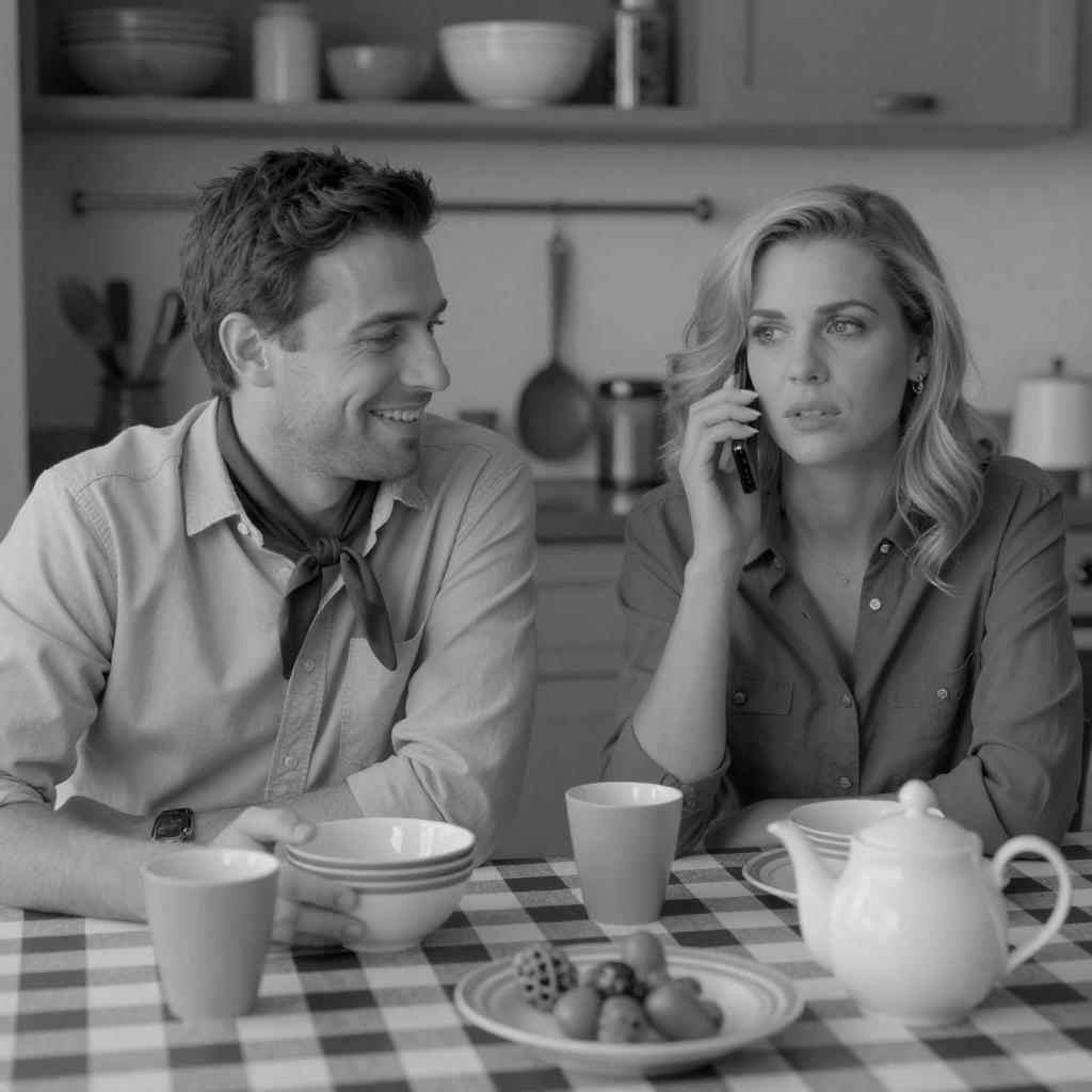 Black and white photograph showing three people standing in a kitchen. In the foreground, a blonde woman wearing a floral dress looks down with a neutral expression. Behind her, a man dressed in a white shirt and dark tie also looks down. In the background, another man wearing a hat, cardigan, and casual clothes looks down as well. Kitchen shelves with jars and containers are visible in the background.