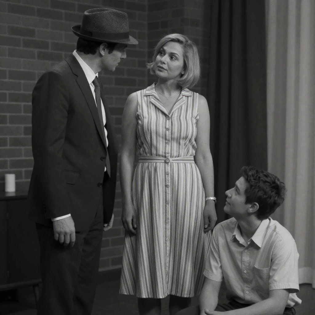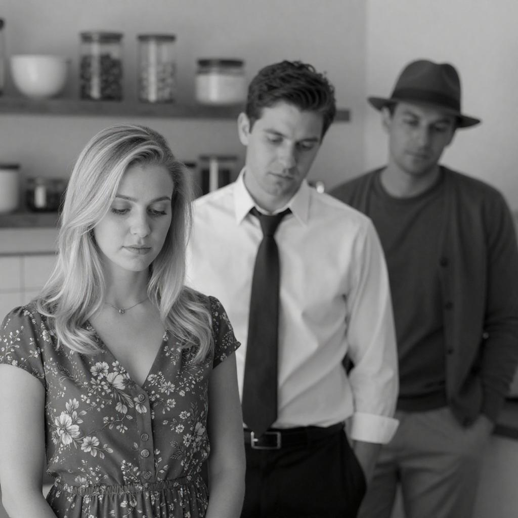 Black and white photograph of three people in a kitchen. Blonde woman in floral dress, looking down, in foreground. Man in white shirt and dark tie, looking down, in middle. Man in hat and cardigan, looking down, in background. Shelves and kitchen items in background. All have neutral facial expressions.