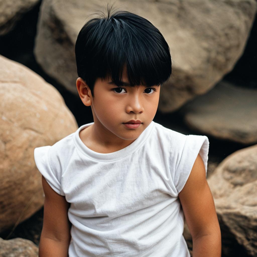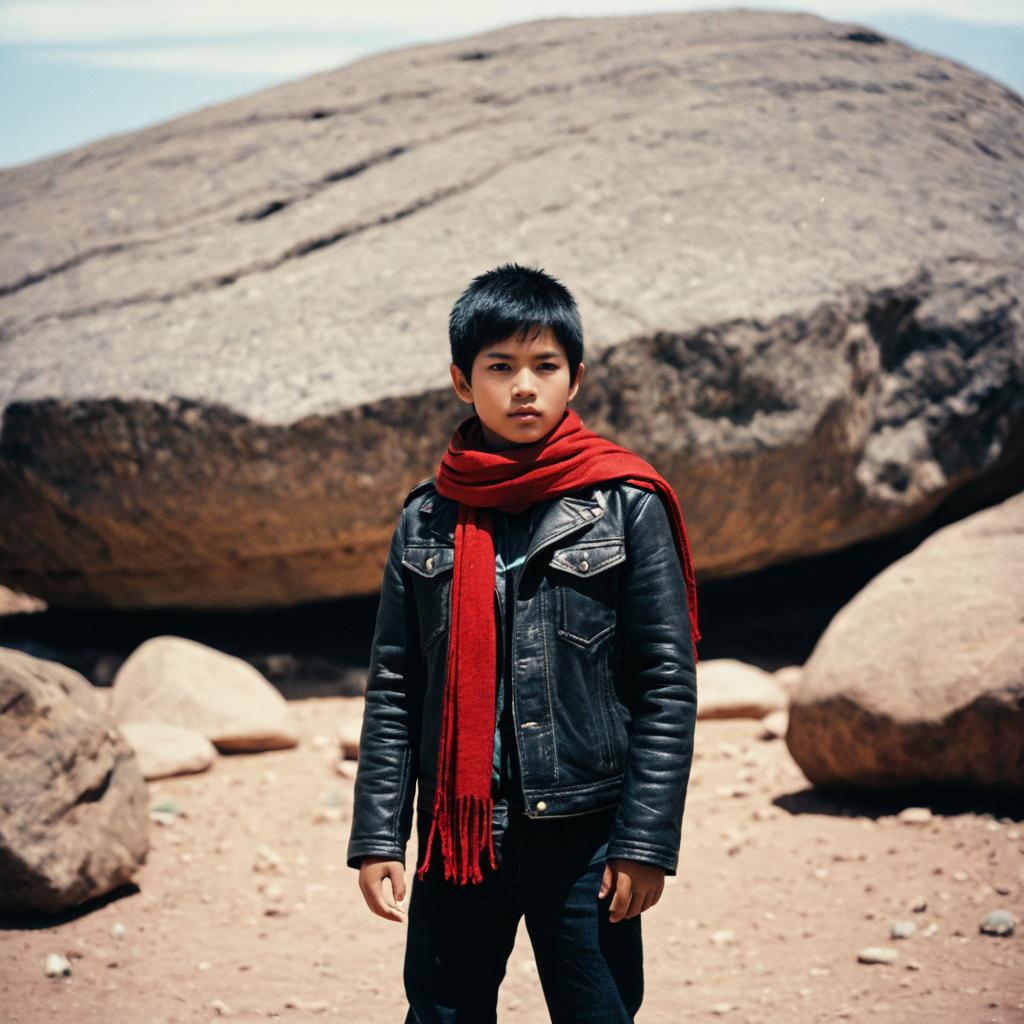 Portrait of a young Asian boy standing in a rocky outdoor setting wearing a black leather jacket and a bright red scarf. He has short black hair and a serious expression, with his gaze directed at the viewer. The background includes large stones and natural terrain under daylight.