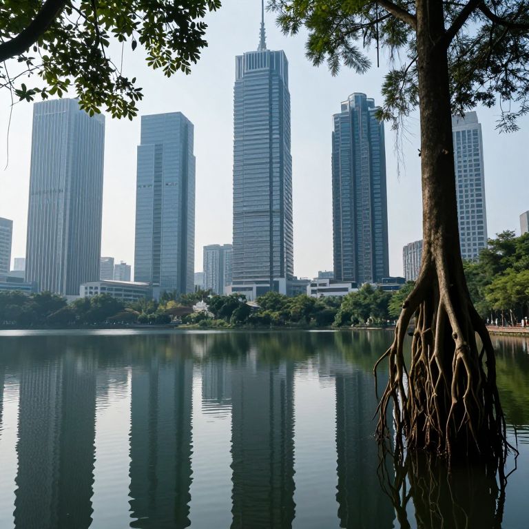 In a surreal inversion of reality, towering skyscrapers emerge from the depths of a tranquil lake, their roots suspended above like ancient trees, evoking a profound sense of wonder and introspection as gravity defies expectation and nature embraces the urban landscape.