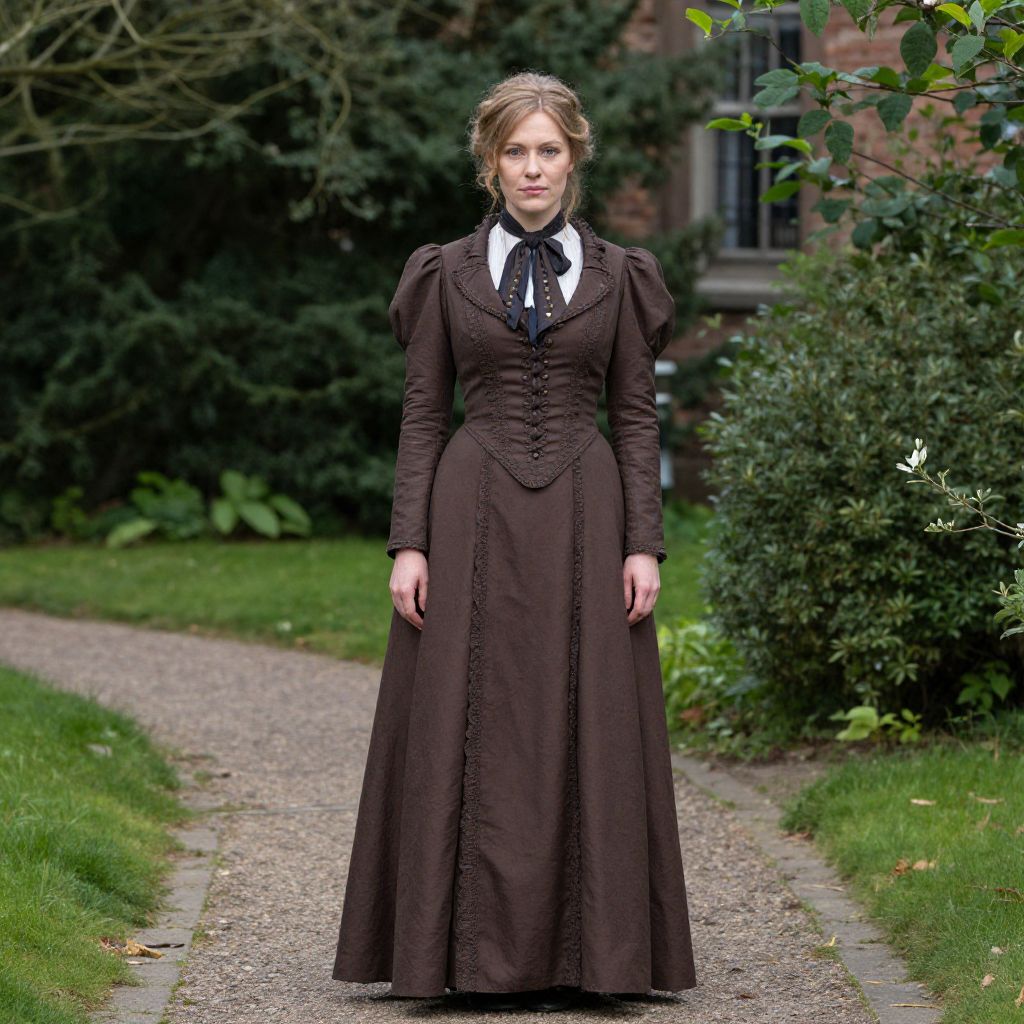 "Victorian Governess Costume, woman in a brown dress posing for a picture"